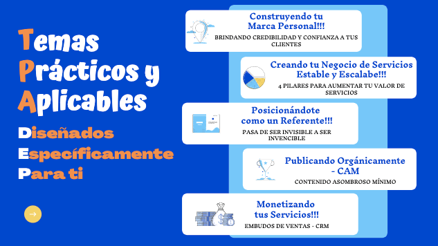 Esta es una serie de episodios por temporadas donde desarrollamos tus habilidades y competencias necesarias para convertir tus talentos en servicios y productos online, a través de lo experiencial, de lo testimonial; generando un incremento exponencial de tus habilidades y experticias para crear servicios y productos vendibles y monetizables en el ámbito digital.